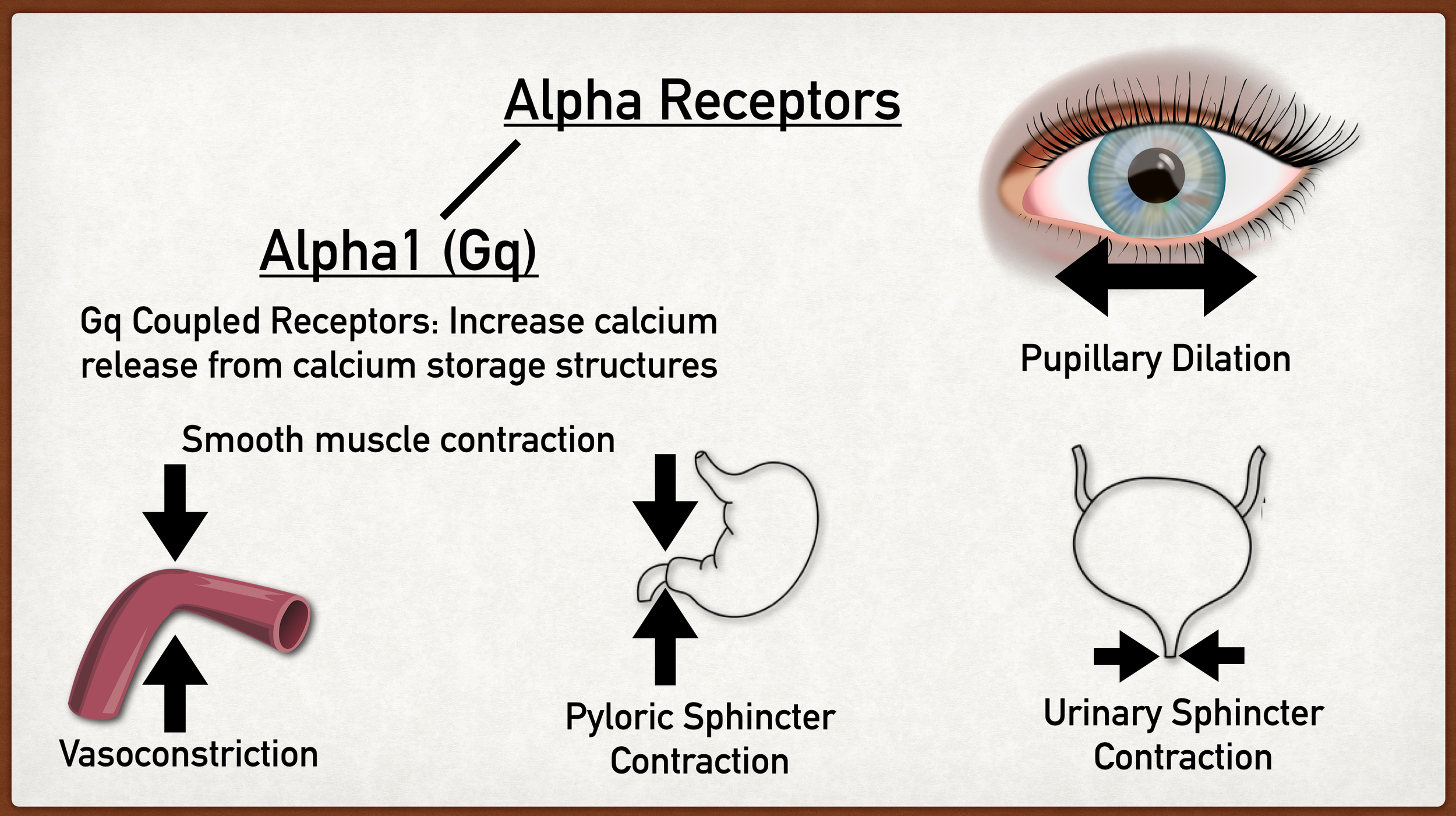 Alpha-1 receptors are Gq protein-coupled and will increase release of calcium from calcium storage structures. This will lead to smooth muscle contraction. Alpha-1 receptors on blood vessels will lead to vasoconstriction. Alpha-1 receptors on the pylorus and urethral sphincter will lead to contraction and decreased digestion and urination, respectively. Alpha-1 receptors of the iris dilator muscle will lead to pupillary dilation (mydriasis).