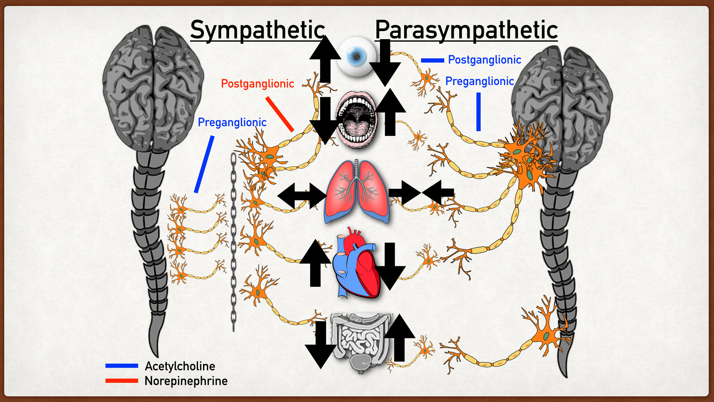 Postganglionic sympathetic neurons release norepinephrine onto adrenergic receptors of target organs to generate the sympathetic response. Postganglionic parasympathetic neurons release acetylcholine onto muscarinic receptors of target organs to generate the parasympathetic response.