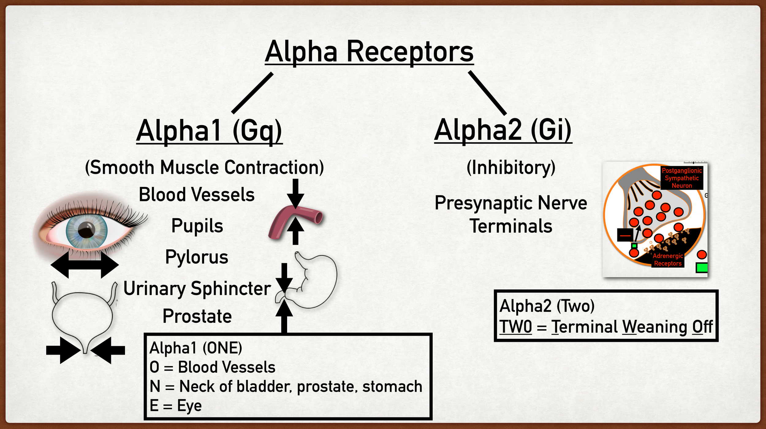 Alpha-1 receptors are located on structures such as the vasculature, prostate, urethral sphincter, pylorus and will cause smooth muscle contraction. Alpha-2 receptors are found on presynaptic nerve terminals and inhibit further release of norepinephrine.