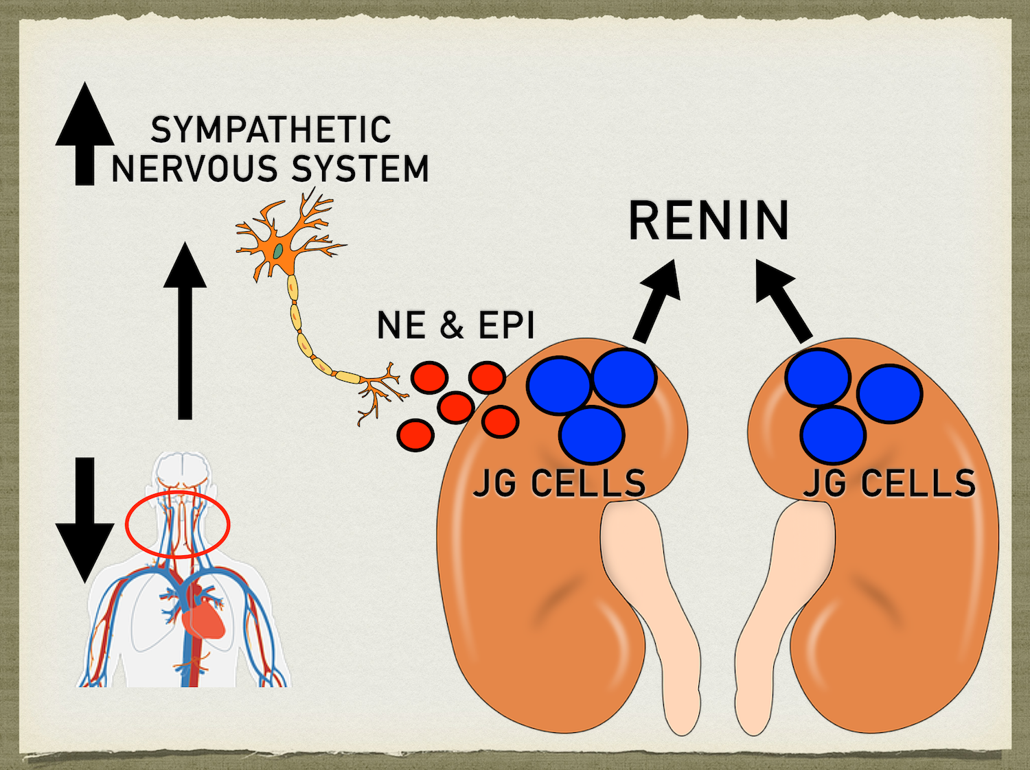 Carotid Baroreceptors - Carotid baroreceptors activate the SNS in the presence of decreased intravascular pressure. The SNS causes the JG cells to release renin as described in the first illustration above.