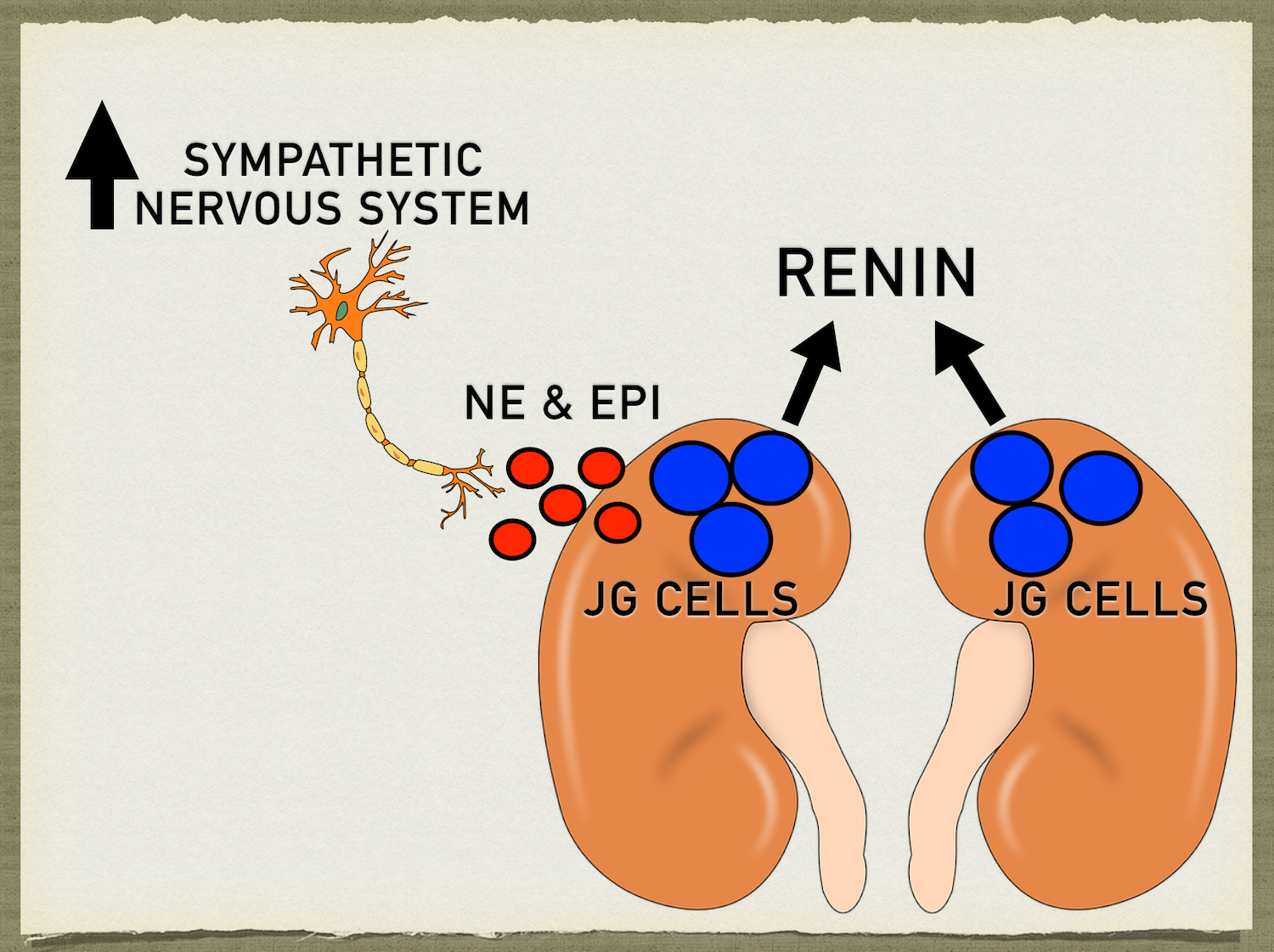 The JG cells express beta-1 adrenergic receptors and are therefore directly activated by the sympathetic nervous system to release renin.