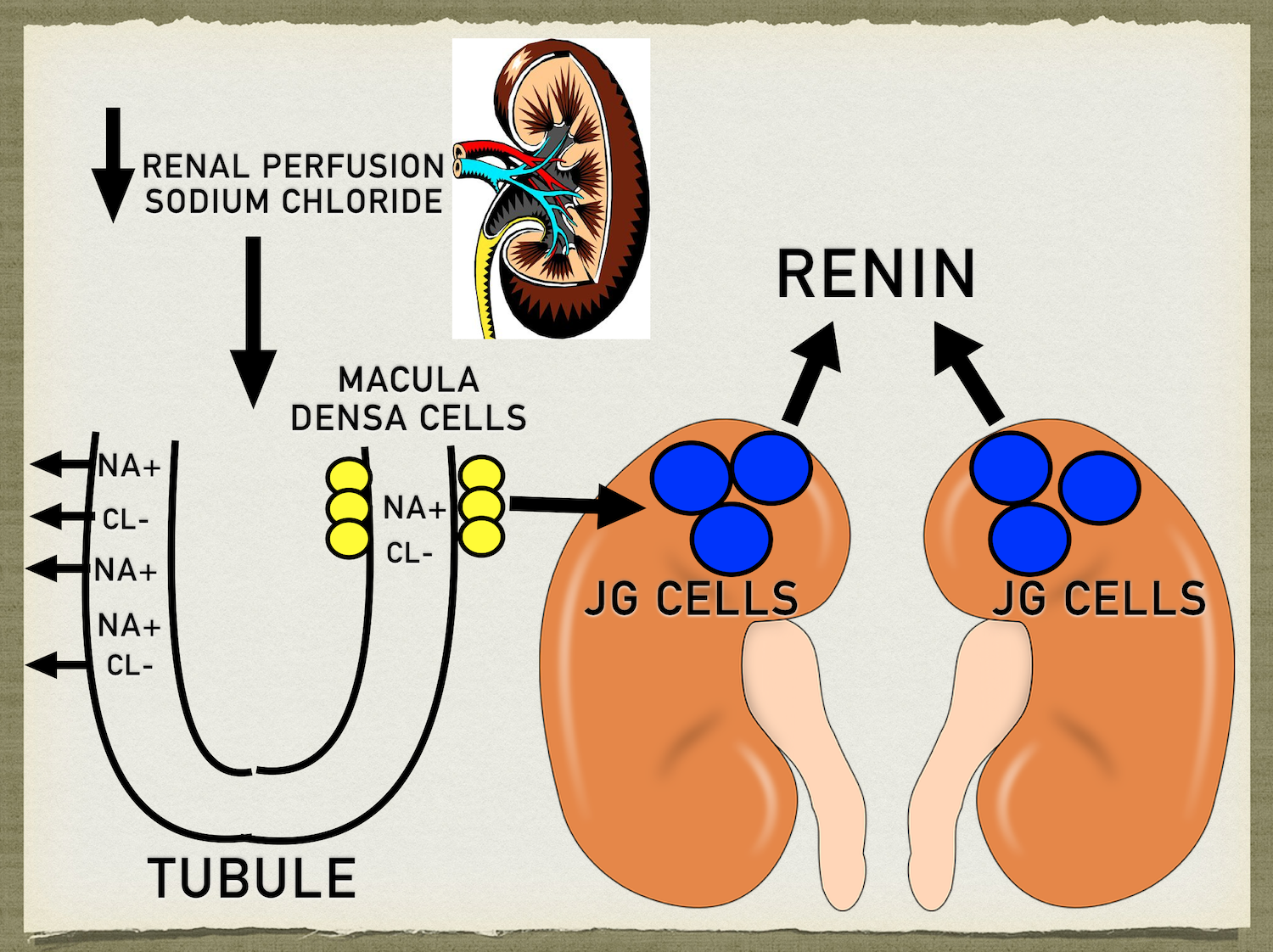 The JG cells are also stimulated to release renin when the macula densa cells of the distal tubule detect decreased renal tubular sodium and chloride levels.