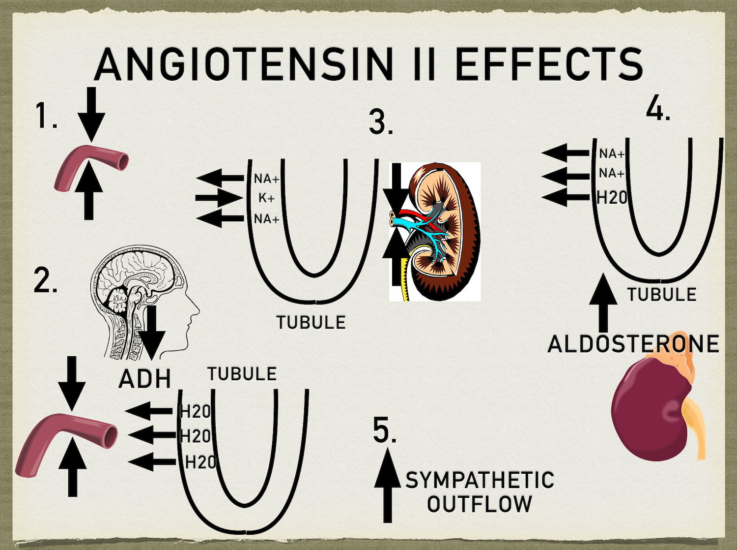 We now have angiotensin II which has multiple downstream effects to improve blood pressure, fluid imbalance, and electrolyte imbalance discussed below.